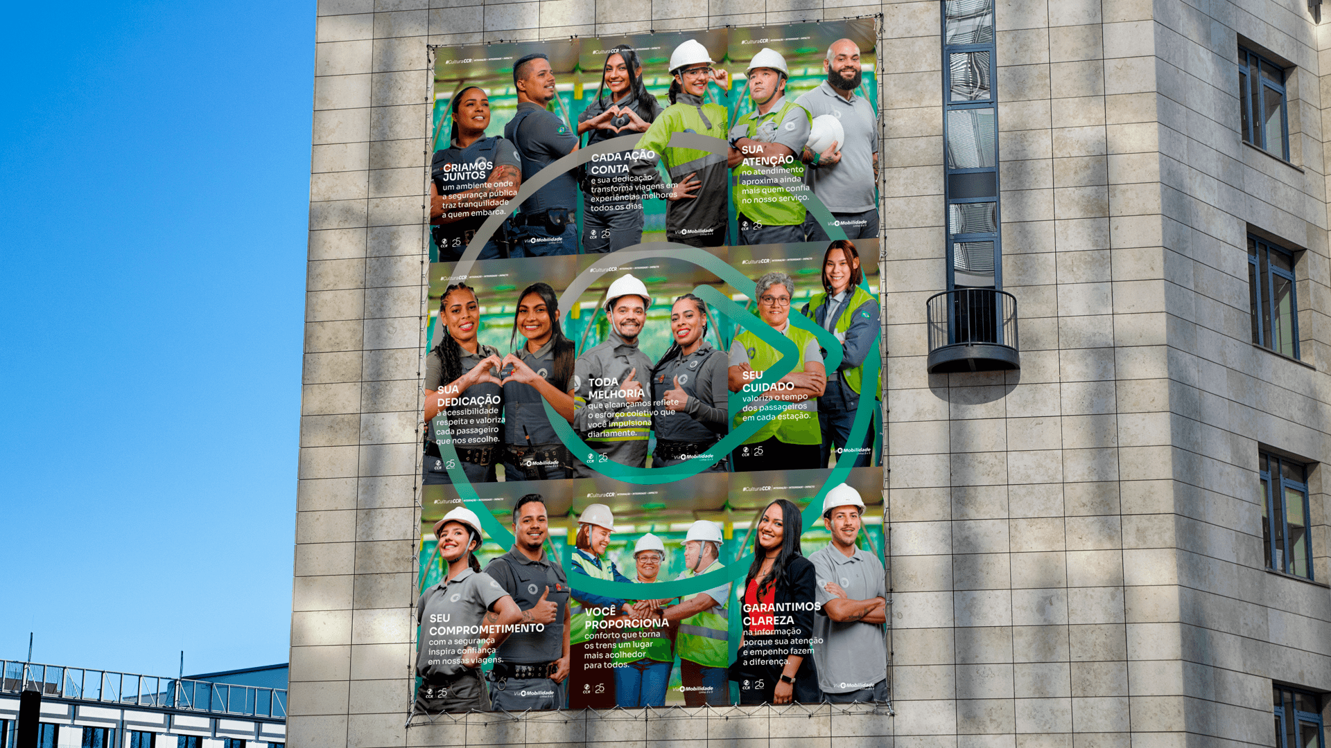 A campanha foi divulgada em etapas para manter presença contínua nos ambientes internos. No encerramento, todas as peças foram reunidas em um mosaico que formou o símbolo da ViaMobilidade, criando uma representação visual do que a campanha expressava desde o início: a cultura da empresa é construída por pessoas reais, na prática diária, com ações que produzem valor individual e coletivo.